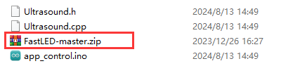 根据“1.教程资料\2.Arduino环境搭建\2.2 Arduino IDE使用说明”课程,将本节同目录下“出厂程序\app_control”中的.zip库文件压缩包导入Arduino IDE中(若在前面的课程中已导入FastLED-master.zip库文件,则可跳过此步骤)。