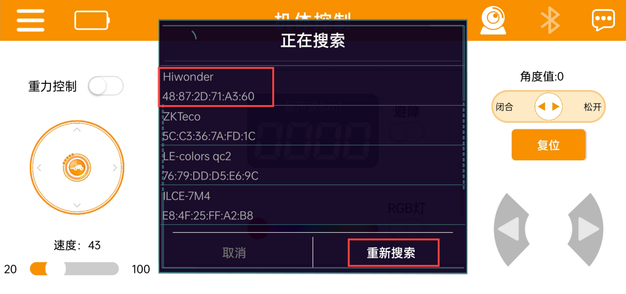 若未看到“Hiwonder”的名称,请点击“重新搜索”来查找设备。