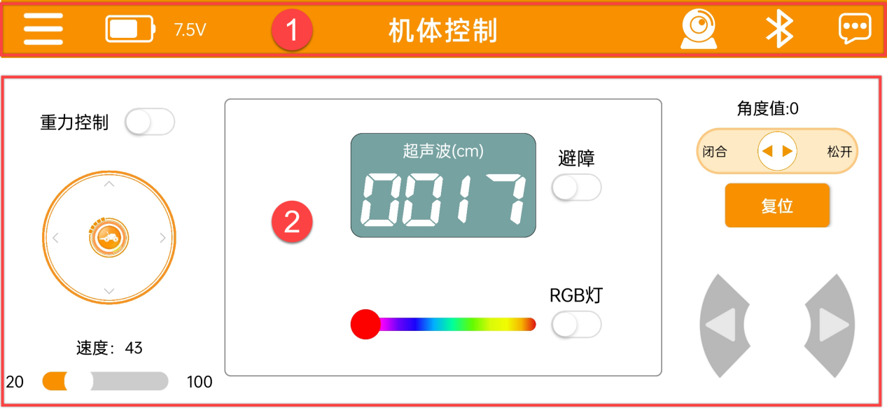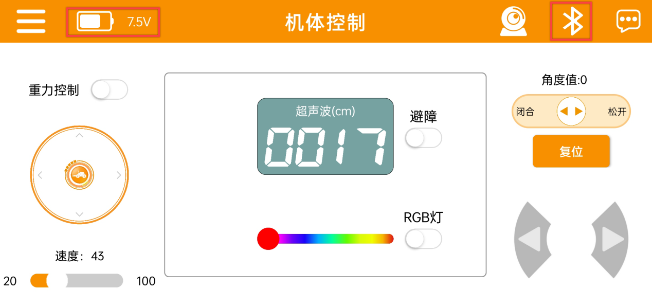![]() | 显示超声波探测距离,点击避障按钮,开启超声波避障 |