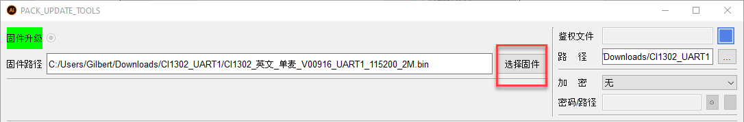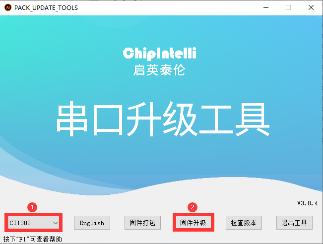 2. 打开本文同路径“固件烧录工具”下的“PACK_UPDATE_TOOL.exe”文件,选择“CI1302”芯片,然后点击“固件升级”。
