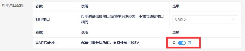 6. 在打印串口配置中,将UART0电平配置为开漏功能,支持外部上拉5V。