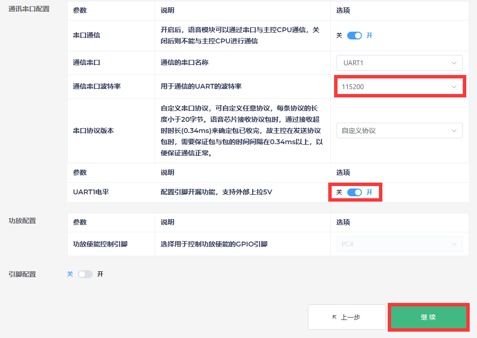 7. 对通讯串口配置进行修改,设置波特率为115200,并配置UART1电平为开漏功能,支持外部上拉5V,配置完成后点击“继续”进入下一步。