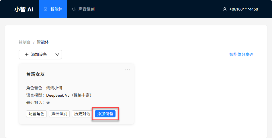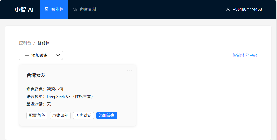 1. 若用户初次登录,需要使用注册平台账号,账号注册流程此处不再展开。完成注册登录后,进入如下界面,平台默认生成一个智能体,稍后我们将在此基础上补充配置,并将设备ID绑定至此智能体。