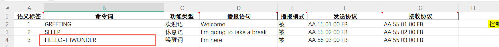 如果要修改唤醒词可打开(命令词播报词协议列表V3_英文模板表格,将里面的“HELLO-HIWONDER"修改成自己需要的唤醒词。(英文版本的唤醒词只能使用英文的唤醒,无法中英文共用,并且英文的唤醒词要大写才生效)