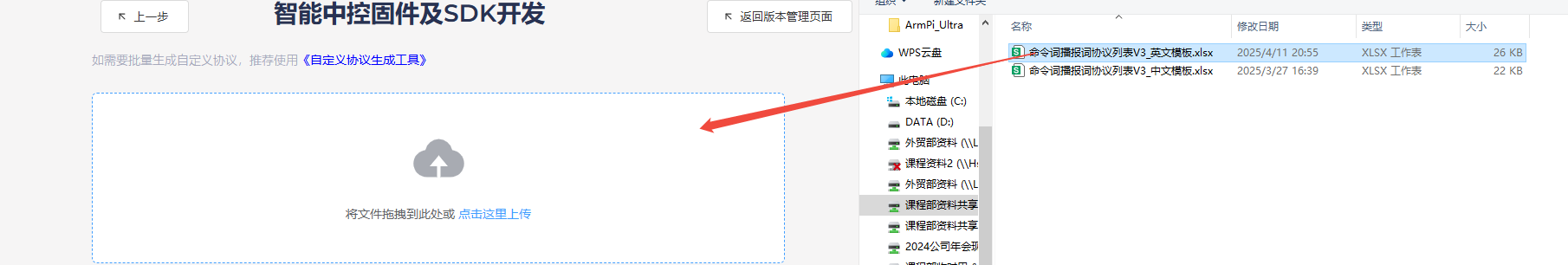 1. 接着我们将命令词附件进行上传,找到“命令词播报词协议列表V3_英文模板”表格(路径:“1.10 唤醒词修改\1.10.2 命令词播报词协议列表”,直接拖入到网页中进行上传。(本步骤以英文版本进行介绍,中文版本请见下文“中文唤醒词制作”)