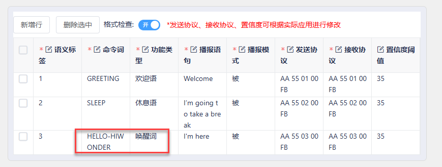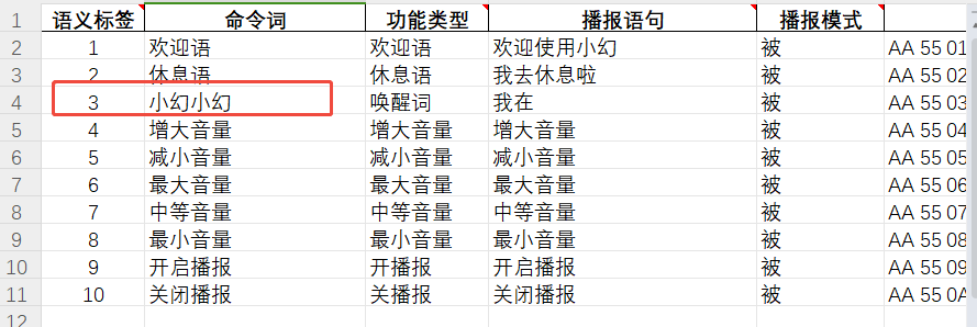 如果要修改唤醒词可打开“(小幻小幻)命令词播报词协议列表V3_中文模板”表格,将里面的“小幻小幻”修改成自己需要的唤醒词,然后重复(15)、(16)的步骤即可。