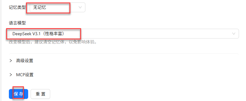 1. 记忆体类型选“无记忆”,语言模型项推荐选择“DeepSeek V3(性格丰富)”,高级设置项可调节更多详细工作参数,此处保持默认设置,最后点击"保存"即可。