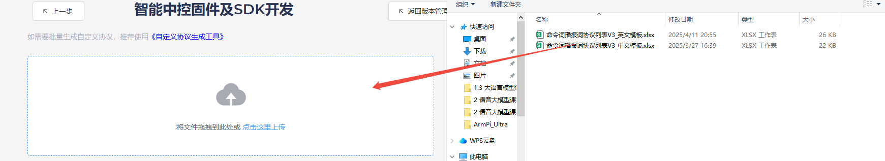 我们以“小幻,小幻”为例,找到“命令词播报词协议列表V3_中文模板”表格(路径:1.10 唤醒词修改\1.10.2 命令词播报词协议列表),直接拖入到网页中进行上传。