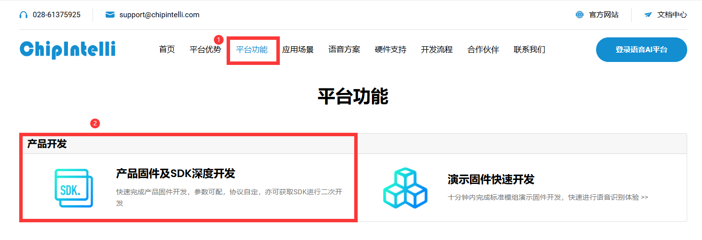 2. 点击菜单栏的“平台功能”,再点击产品开发栏下的“产品固件及SDK深度开发”。