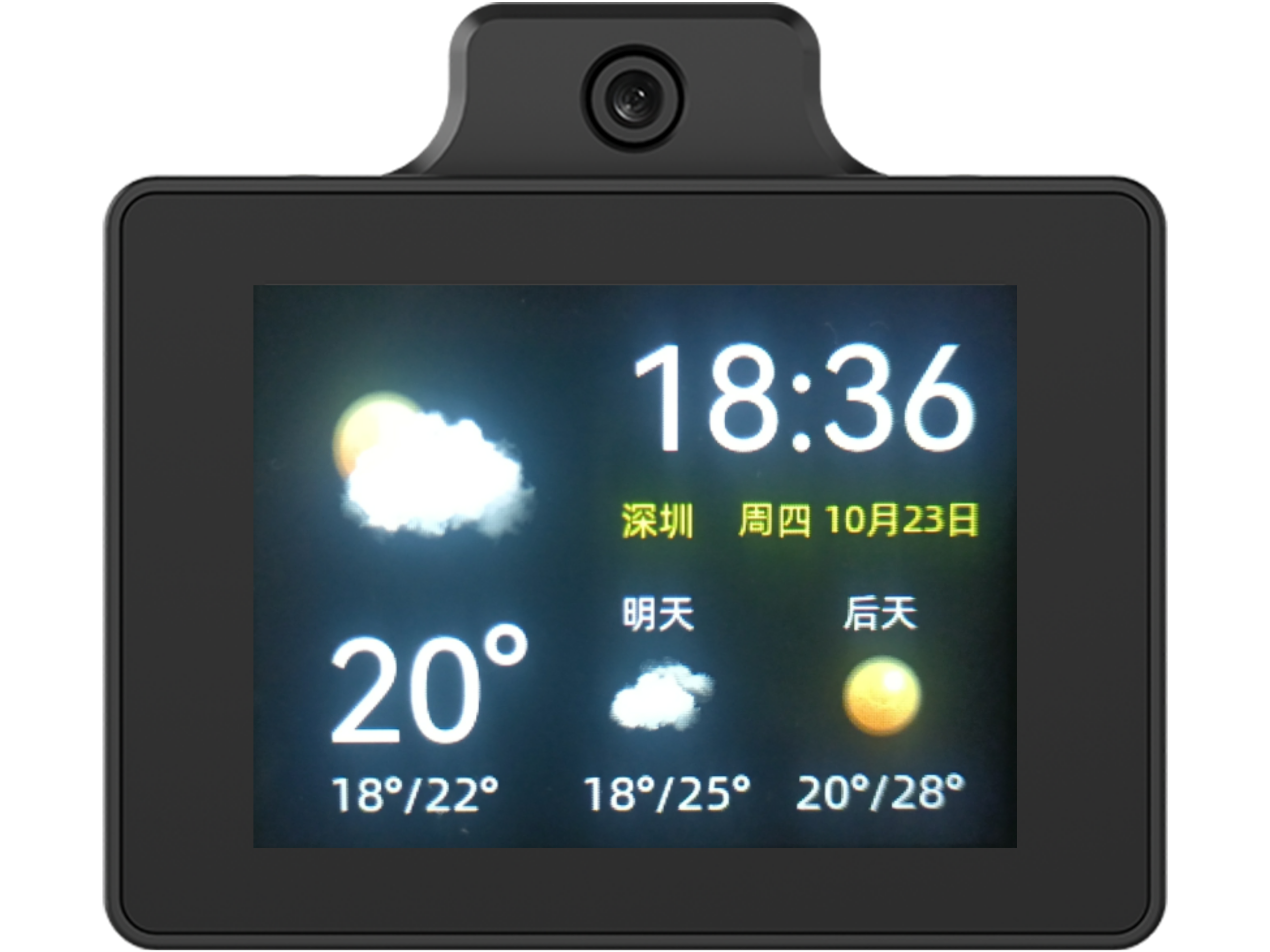 • 如果在表情界面超过20秒没说出唤醒词,模块将进入天气时钟模式(界面如下)。用户可单击屏幕任一位置回到表情模式,此外天气时钟模式同样支持通过说出唤醒词/短按右侧按键进入聊天模式。