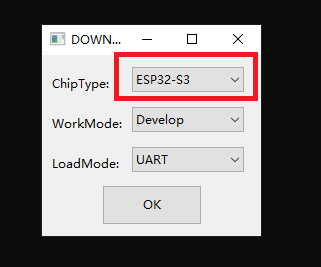 2. 选择Chip Type为ESP32-S3,其他保持默认,然后点击OK。