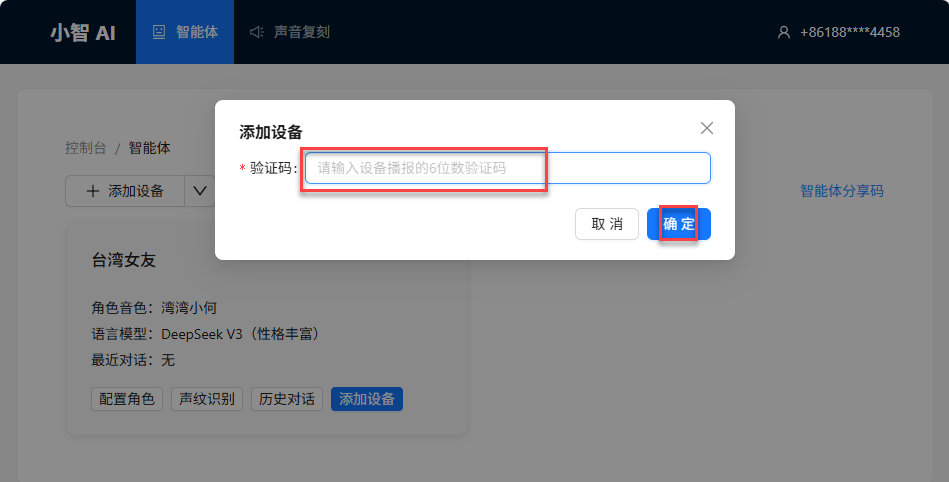 1. 在弹窗输入6位设备ID,点击确定,即完成设备绑定 。