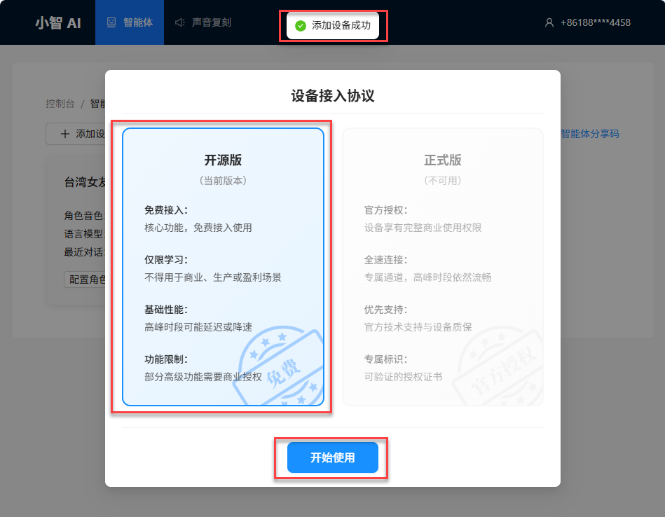 1. 若绑定成功,可在页面观察到“添加设备成功”提示,如下图 。选择“开源版”,点击“开始使用”。