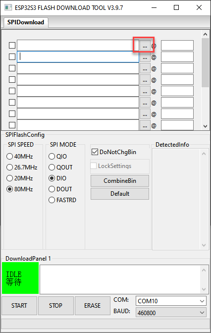 3. 工具打开后,点击“...”选择需要烧录的程序bin文件(存放路径:“7.11 固件下载\7.10.3 ESP32S3固件”)。下面以我司出厂固件WonderMind.bin为例: