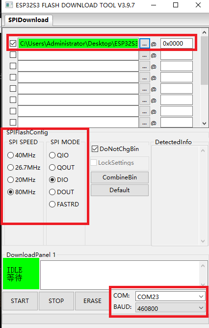 如果您按下图的配置,将SPI MODE设置为DIO,烧录固件后模块无法正常工作;请尝试将SPI MODE设置为DOUT并再次烧录。