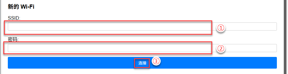 1. 用户可在下图①中输入期望模块上电自动连接热点的热点名称,②中输入热点的连接密码。最后点击③中的“连接”,模块会尝试根据用户提供的热点连接信息,在当前所处环境寻找匹配的热点并连接。