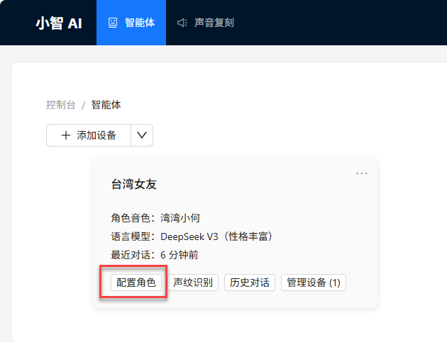 2. 进入小智AI平台:xiaozhi.me,也可点击小智 AI 聊天机器人超链接直接访问。进入控制台,选择模块绑定的智能体,选择“配置角色”,将助手昵称同步修改为新设定唤醒词,点击“保存”并重启设备即可。