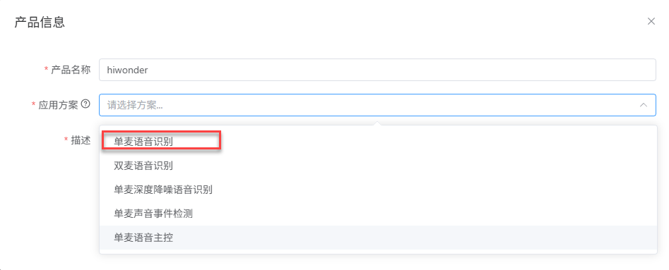 2. 当页面跳转后,在左侧点击,按照下图新建一个产品,其中产品名称和描述可自定义,应用方案需要选择“单麦语音识别”。