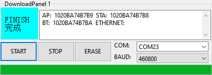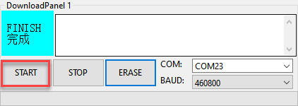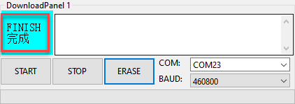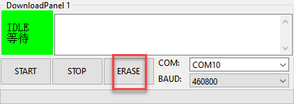 1. 先点击"ERASE"擦除之前下载的固件(一定要进行),等待状态栏显示“FINISH完成”。