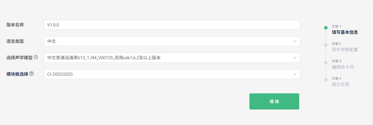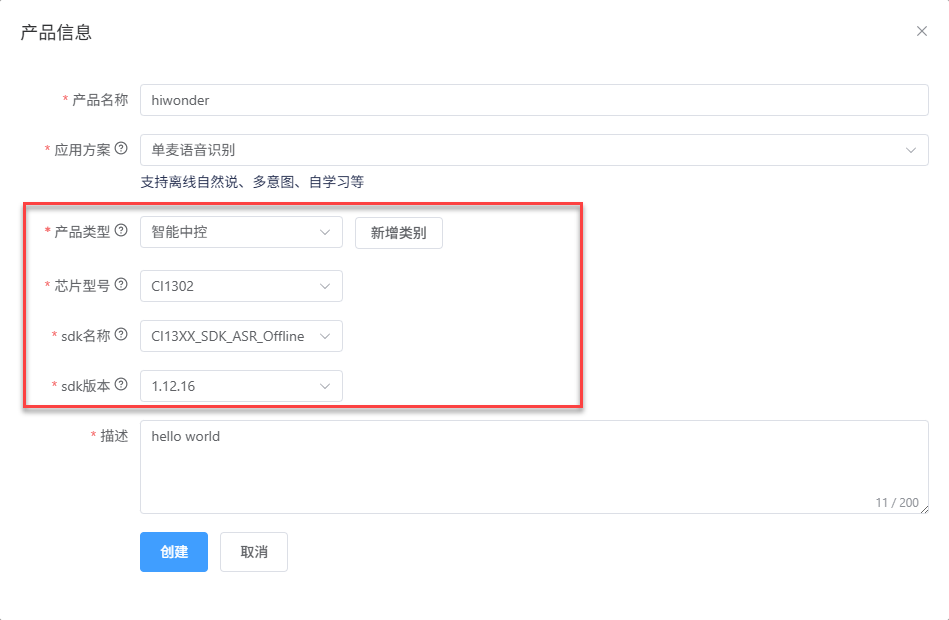 1. 在弹出的参数项中,产品类型选择“通用->智能中控”,芯片型号选择“CI1302”。之后继续弹出sdk名称,这里选择“CI13XX_SDK_ASR_Offline