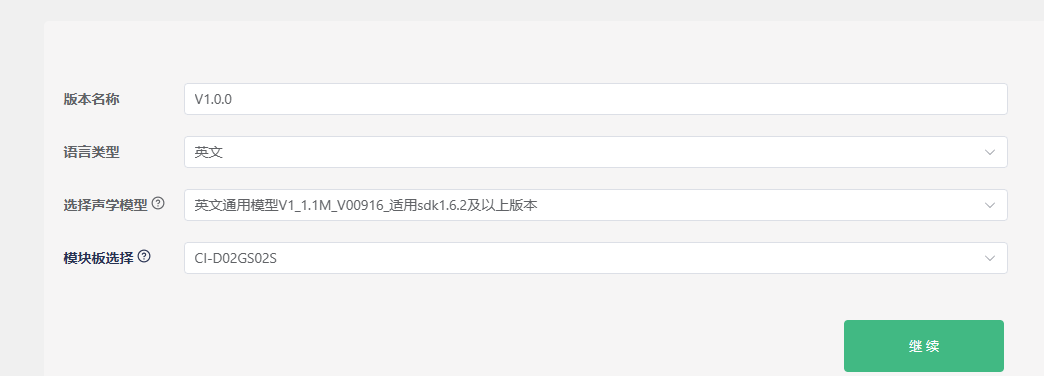 3. 接下来填写项目的基本信息,我们需要识别英文,那么语言类型选择“英文”(识别中文只需要“语音类型”选择及“选择声学模型”选为中文即可),其余信息按照下图选择,完成后点击“继续”。